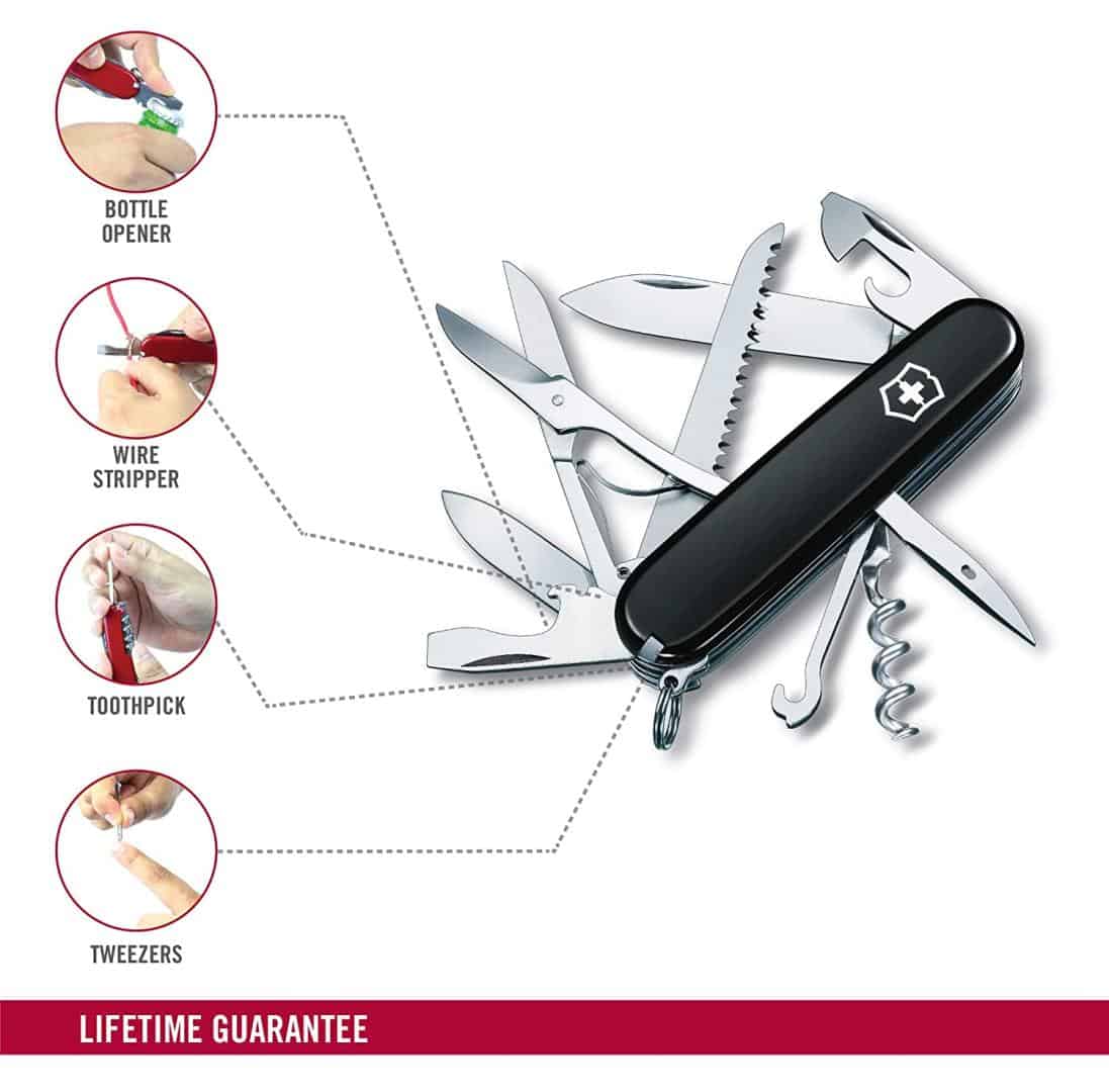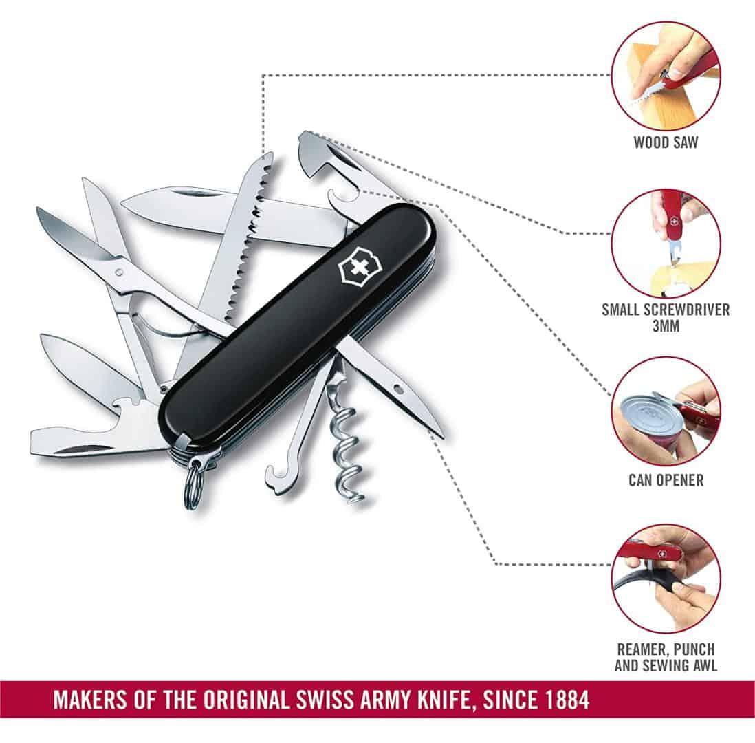 Dụng cu dao xếp đa năng bỏ túi để sử dụng hằng ngày. Khi bạn nghe thấy cụm từ Swiss Army Knife, rất có thể bạn sẽ nghĩ đến con dao huyền thoại của Sĩ quan, và huyền thoại đó tiếp tục ” sinh ra ” với con dao bỏ túi hay còn gọi là dụng cụ đa năng Victorinox Huntsman. Với việc bổ sung kéo và cưa gỗ, bạn đã sẵn sàng cắt bất cứ thứ gì. Dụng Cụ Đa Năng Victorinox Huntsman G/Nere. 1.3713.3 nhỏ gọn, tiện dụng và sẵn sàng cho bất cứ cuộc phiêu lưu, dã ngoại nào. Được phát minh từ năm 1884 với 15 công năng cụ thể cho từng mục đích sử dụng của bạn. Hãy cùng Minh House tìm hiểu những thông tin chi tiết của sản phẩm này nhé.