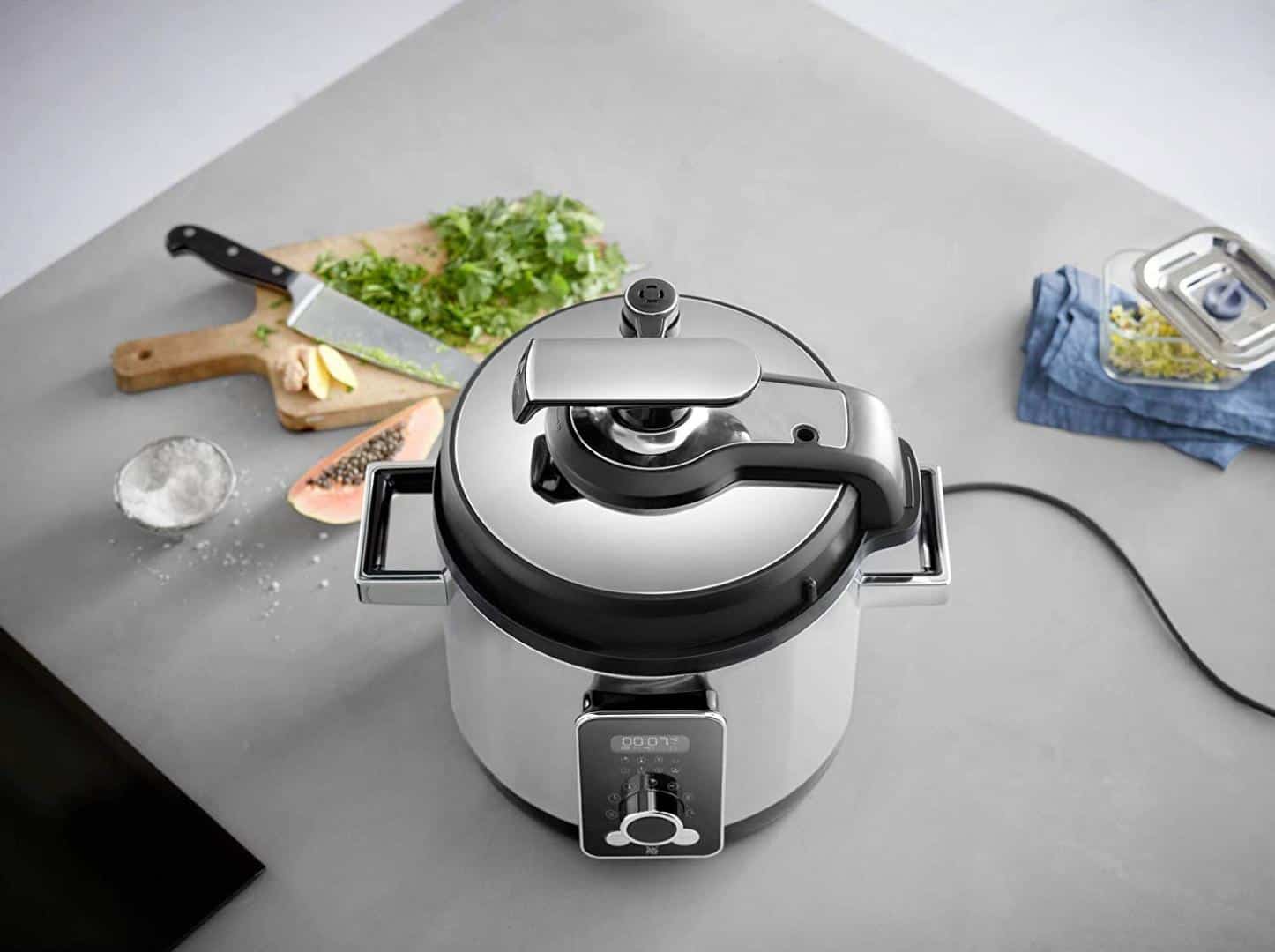 Nồi Áp Suất Điện Wmf Lono 8 in 1 Multifunktionskocher với 8 chức năng chỉ trong một thiết bị: nấu áp suất, nấu chậm, hấp, nấu cơm và đậu, xào, giữ ấm, áp chảo và bảo quản.