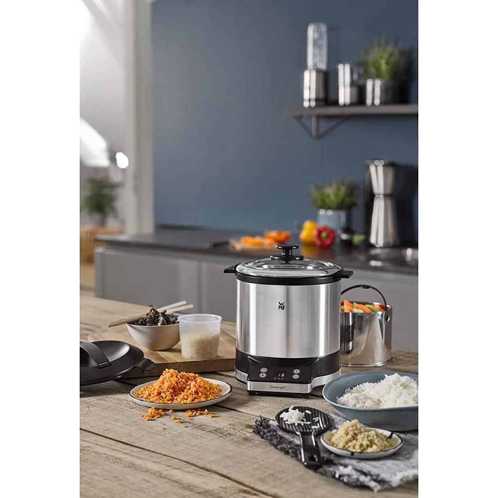 Nồi cơm điện mini WMF Ngoài tính năng nấu cơm, nấu các loại hạt như hạt diêm mạch Quinoa, hạt đậu năng Linsen, cơm gạo lứt, nấu rau củ, còn có tính năng hấp, hầm, giữ ấm.