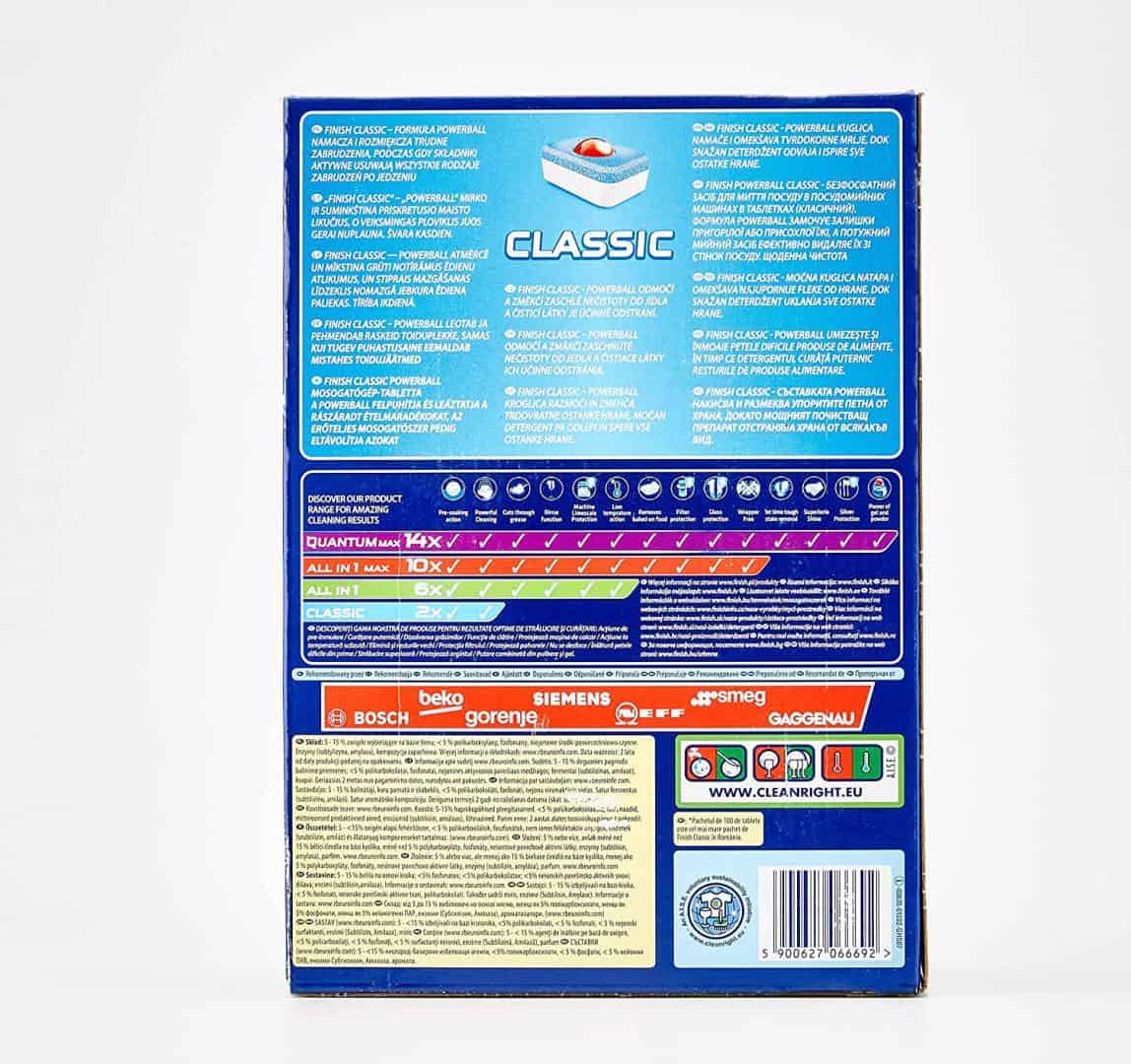 Viên Rửa Bát Finish Powerball Classic Hộp 100 Viên là chất tẩy rửa vệ sinh làm sạch trong máy rửa chén, bát ở dạng viên, nếu bạn nhìn sẽ rất giống như bánh xà phòng. Viên Rửa Bát Finish Powerball Classic có tác dụng tẩy sạch những cặn bẩn của thức ăn vụn, thừa còn dính trên bát, đĩa, xoong, nồi, chảo… Nhờ đó mà máy rửa chén, bát của bạn luôn có mùi thơm, dịu.